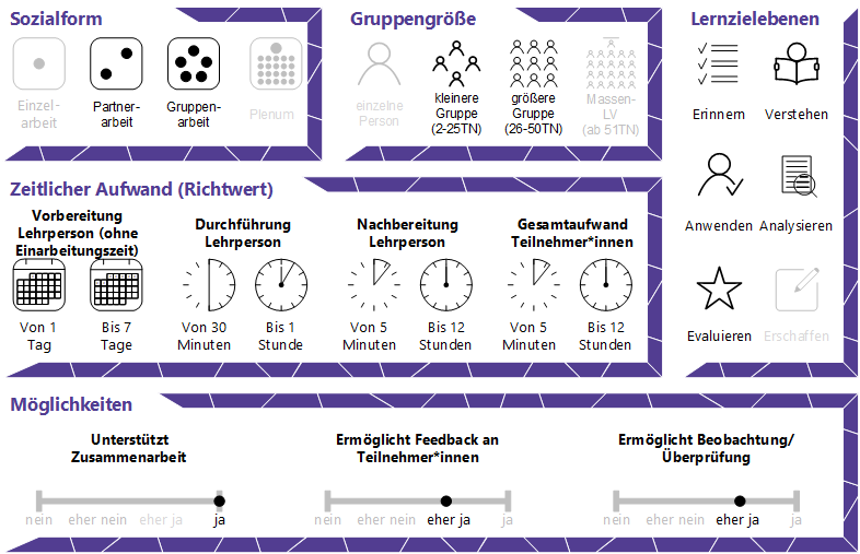 - Participants: Ausgangspunkt ist die Analyse der Zielgruppe. Dazu gehören Fragen nach dem erwartbaren Vorwissen, dem angemessenen Schwierigkeitsgrad sowie den verfügbaren technischen Ressourcen wie Notebook, Smartphone oder Kopfhörer. Darüber hinaus sind auch die Gruppengröße und Rollenverteilung mitzudenken.